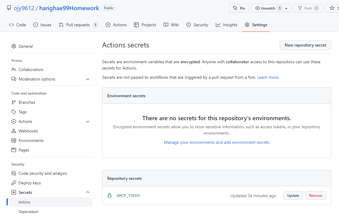secrets 등록 공개되면 안되는 값들을 이 곳에 작성해준다. 나는 프로퍼티 파일도 여기에 등록했다. Git actions / yml 파일 등록 name: Java CI with Gradle on: push: branches: [ "ojyojy" ] pull_request: branches: [ "ojyojy" ] jobs: build: runs-on: ubuntu-20.04 steps: - uses: actions/checkout@v2 - name: Set up JDK 11 uses: actions/setup-java@v1 with: java-version: 11 ## create application.properties - name: make application.properties if: true..
